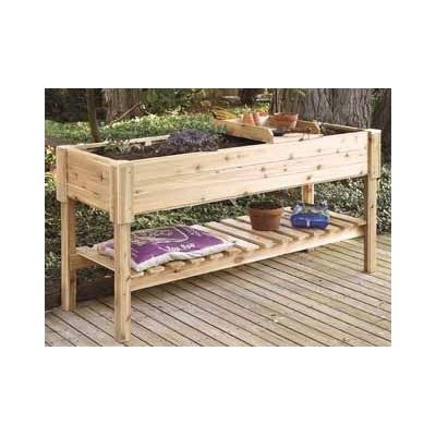 2472 Features: -Potting tray is not included.-Clear Cedar.-Raised Planter.-Holds 7 Inches of Soil.-Made in the USA. Includes: -Shelf is included. Dimensions: -Overall Dimensions: 35.25'' H x 71.75'' W x 23.25'' D.
