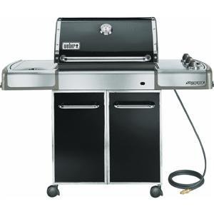 Weber Genesis EP-320, Natural Gas Premium Grill, Black, Features An Enclosed Cart With Corresponding Painted Steel Doors, Stainless Steel Handles & Accent Colored Painted Side & Rear Panels, Grills Have Accent Colored Painted Steel Frame & A Porcelain Enameled Shroud With A Center Mounted Thermometer & Accent Colored Painted Cast Aluminum End Caps, Cooking System Is Rated At 42,000 BTUs, Plus 12,000 BTU Per HR Input Flush Mount Side Burner, Includes 3 Seamless Stainless Steel Burners & A Crossover Ignition System, Cooking Grates Are 7MM Diameter Stainless Steel Rods With Stainless Steel Flavorizer Bars, Primary Cooking Area Measures 507 SQIN, Warming Rack Area Measures 130 SQIN, Giving A Total Cooking Area Of 637 SQIN, Other Features Include 6 Tool Holders, 2 Heavy Duty Front Locking Casters & 2 Heavy Duty Back Swivel Casters, Includes 10' Flexible Hose, Limited Warranty, Weber Cookbook Included, Premium Features Includes Stainless Steel Grates & Flavorizer Bars.