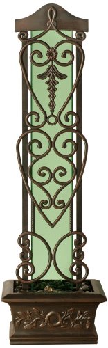 Indoor Design-Outdoor Safe! Free Shipping-Limited Time! The perfect accent to a patio, deck, porch or any outdoor living space. This elegant and decorative indoor/outdoor floor fountain uses a vertical tinted green plate glass waterfall framed with bronze colored cast iron and aluminum sides. The elegant design of the arched header and classical design pedestal reservoir give the unit an unmatched authentic look. Bronze Powder Coated Dimensions 74"H x 24"W x 18"D Pump Included Ideal for Indoor/Outdoor Use 1 year Warranty